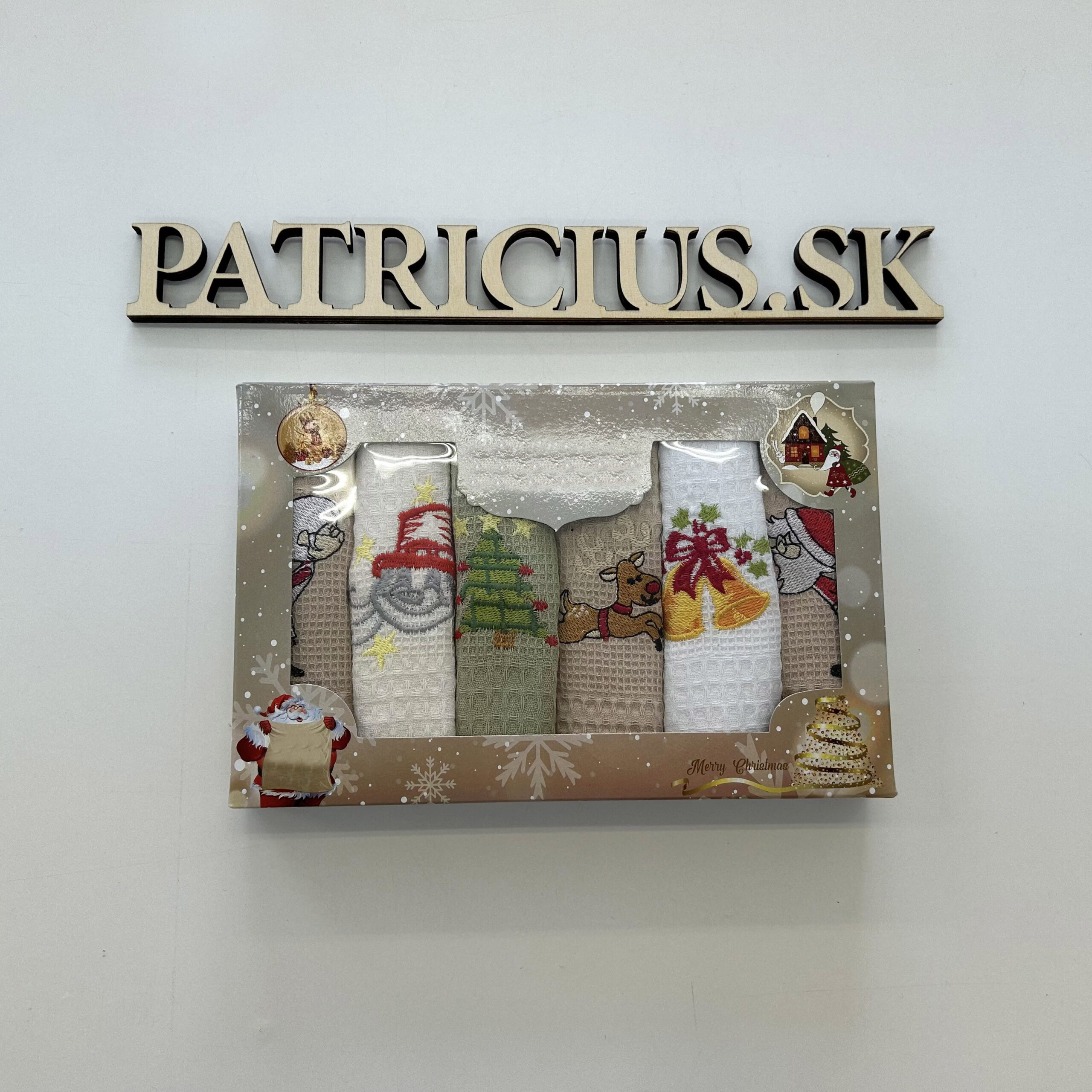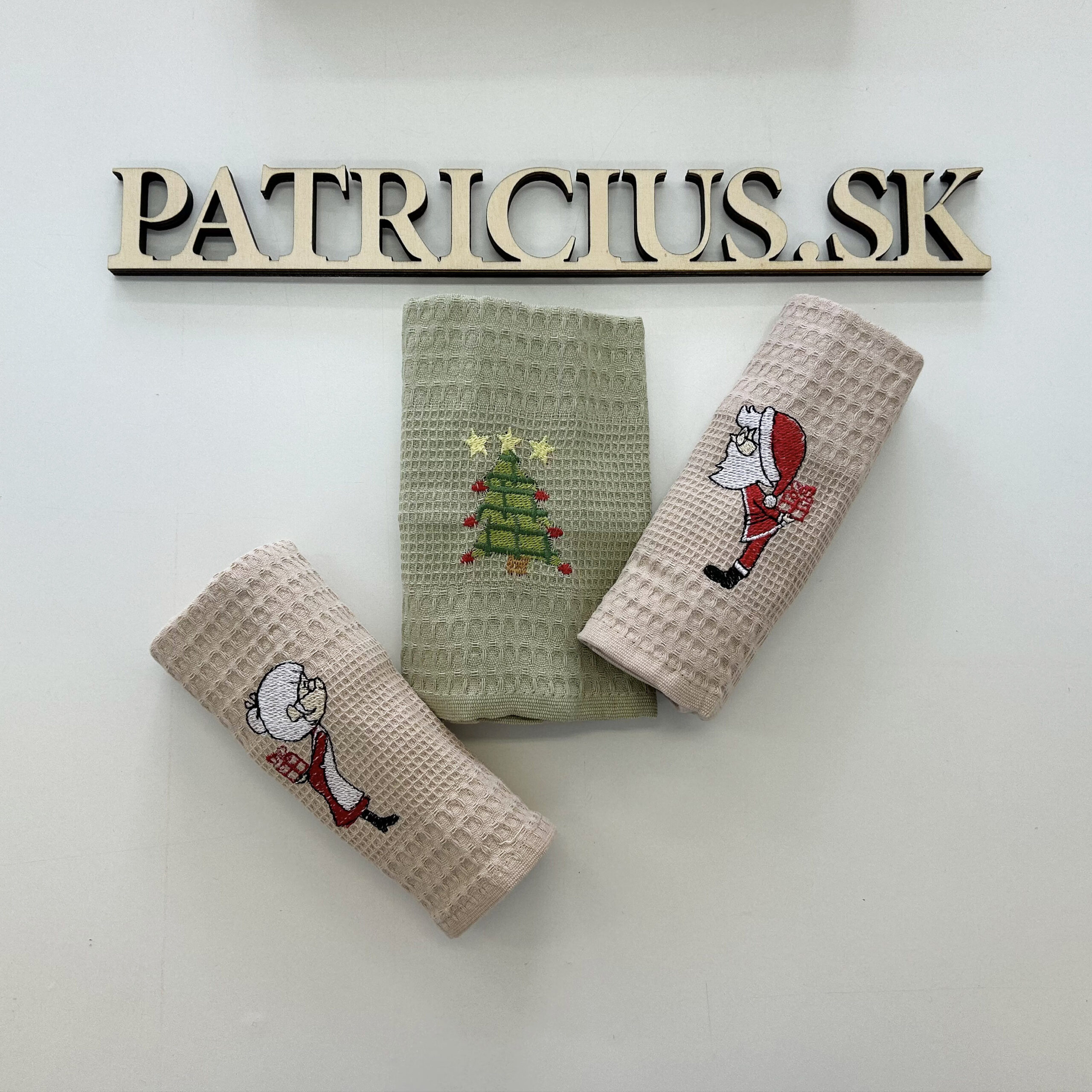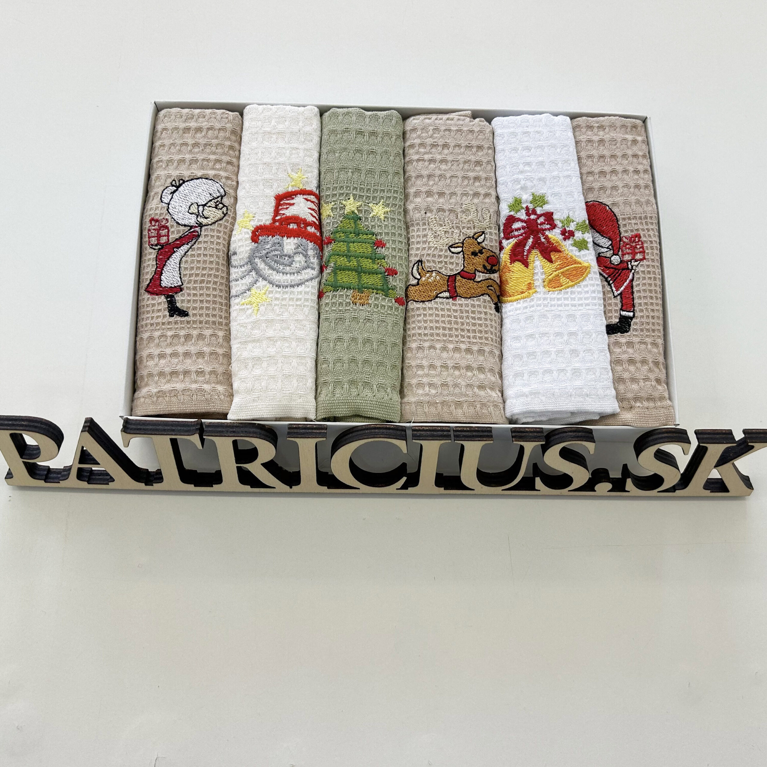 Set kuchynských utierok s výšivkou mikuláša v darčekovom balení.